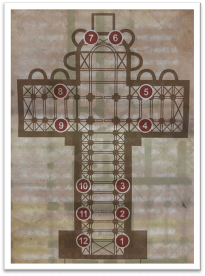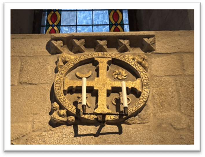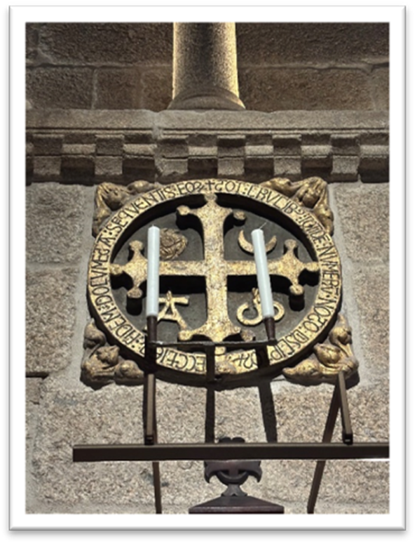What makes this bit of Cathedral history fun is that the details of the consecration are hidden in plain sight today. To memorialize the event in 1211, a dozen discs were set in place on the walls of the new church. They each have at the center a Jerusalem cross, the alpha and omega, and images of the sun and the moon. The key components of the story of the consecration itself are there as well, in short Latin inscriptions that surround the discs. There are also several references to this new church being dedicated to honor Santiago and Jesus, the Son of David.